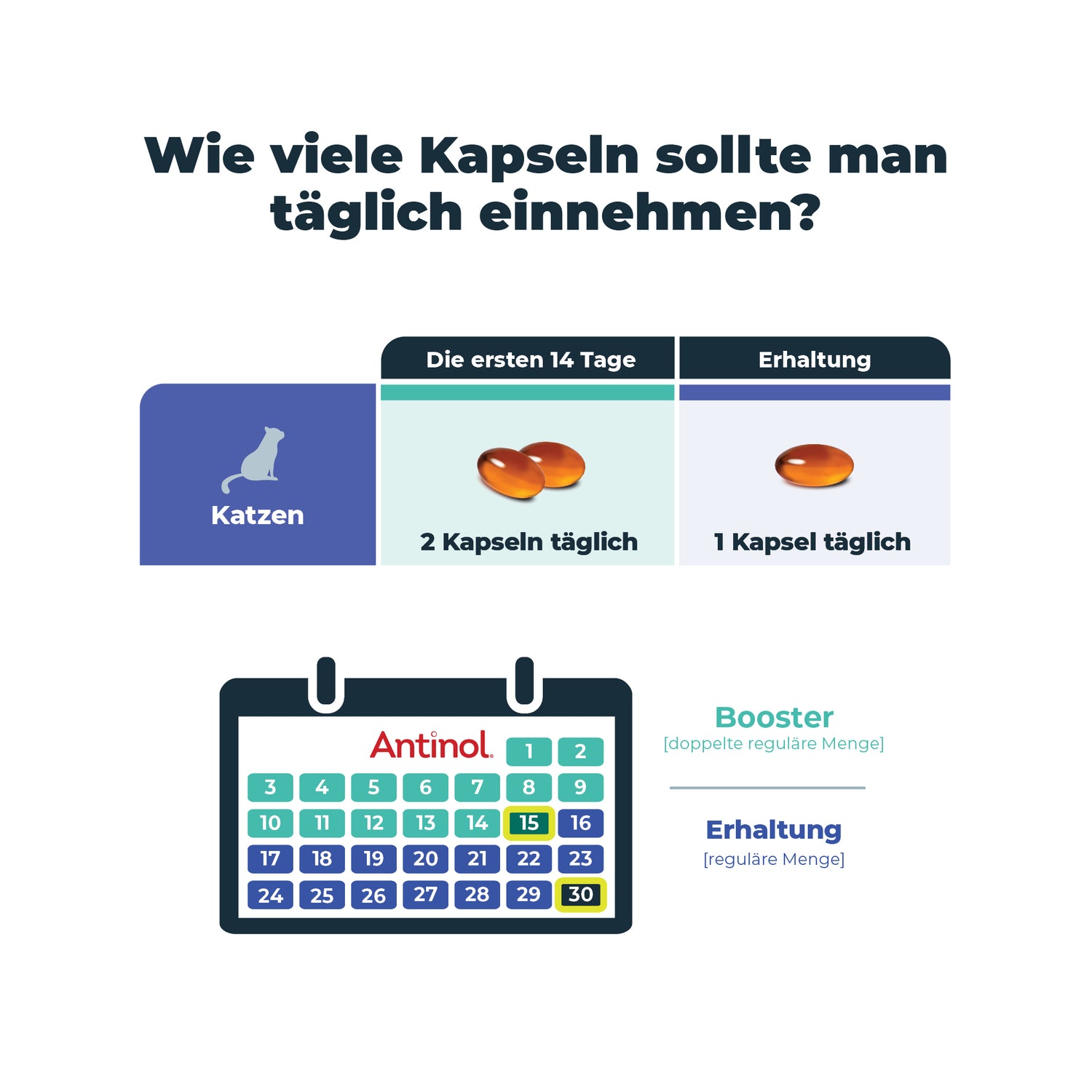 Unsere klinischen Studien zeigen, dass Besitzer, die die lebenslange gesunde Mobilität ihres Haustiers mit Antinol®️ unterstützen wollen, durch die Verdoppelung der Anzahl der verfütterten Kapseln in den ersten 14 Tagen wirklich transformierende Ergebnisse erzielt haben.